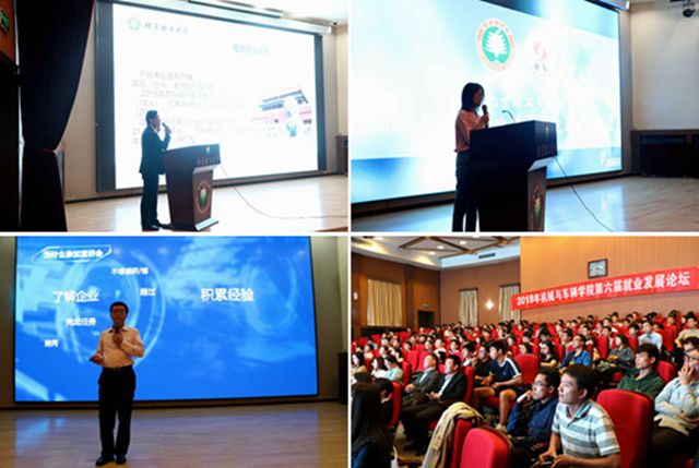 主论坛【平台•对话•分享•成长】之“大众创业,万众创新”背景下应届毕业生就业形势分析、制造业及汽车行业前景分析与汽车行业人才职业发展分享,学院邀请到校、院各级领导、用人单位代表出席活动,面向全校同学开放。主论坛由三部分组成,首先由学生就业指导中心林骥佳主任进行“2019届毕业生就业形势分析与政策解读”主题报告,从自己的就业故事讲起,结合最新出炉的2018届就业数据,对行业用人需求等新形势进行了深入的讲解。随后,学院生涯发展服务中心周雪老师代表学院汇报“2018年机械与车辆学院就业工作报告”,介绍了在就业工作指导思想引领下的工作开展情况和特色创新:学院生涯发展服务中心工作的创新和机制变革,“企业大讲堂”、“笑迎职场”、暑期企业实习项目等特色品牌开展情况。最后,本次论坛活动特别邀请北汽福田汽车股份有限公司人力资源部总监潘平进行了“大众创业,万众创新”背景下制造及汽车行业前景分析与汽车行业人才生涯发展分享。潘平介绍了汽车行业的总体发展与形势、单位用人标准以及应届毕业生在求职面试、职业发展过程中需要考虑清楚、处理得当的问题。