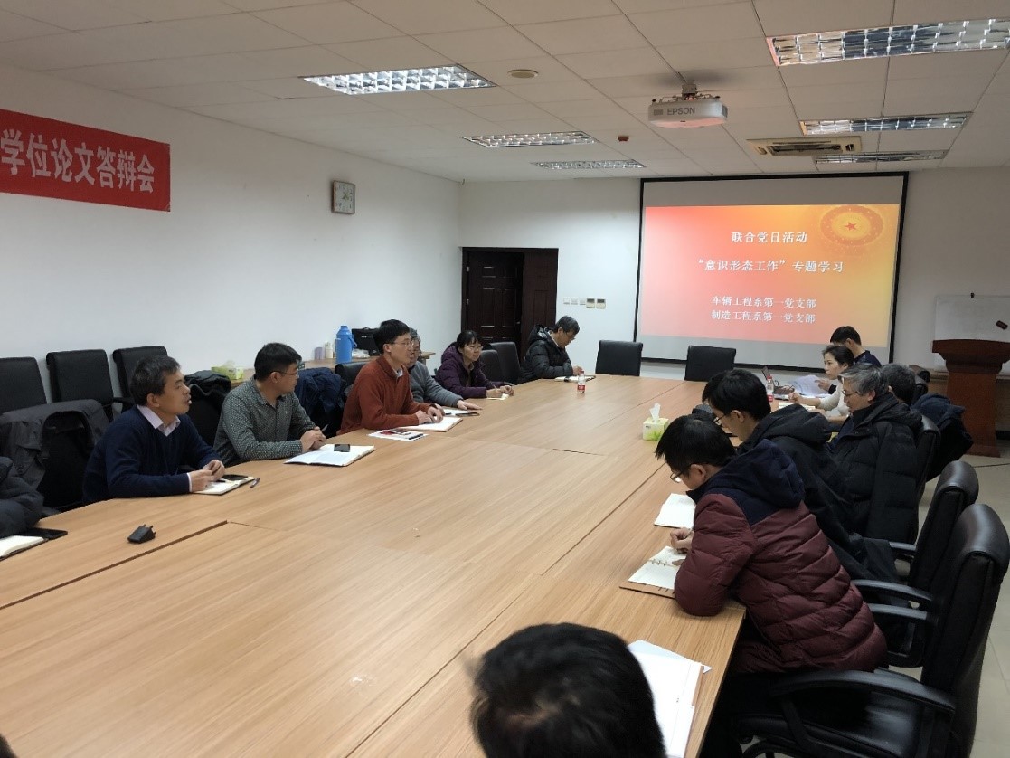 为深入贯彻落实习近平总书记重要指示精神,进一步加强和改进新时期高校意识形态工作在教师基层党支部扎根落实,2019年1月8日下午,北京成品人和一品二品的区别机械与车辆学院车辆工程系第一党支部联合制造工程系第一党支部,在9号教学楼321会议室开展了“意识形态工作”专题学习联合党日活动。