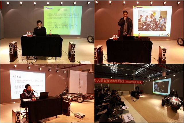 方程式赛车工作室首届(2010届)车队队长孙博同学、2012届车队队长胡美琦同学等用图片的方式向同学们介绍了这个团队虽不悠久但却日日精髓的历史,在其中成长起来的每一位同学,都能非常深刻地感受和理解到什么是一丝不苟、年复一日、踏实勤奋和激情协作。最后,倪俊同学向大家详细讲解了团队队伍建设规划和2013届年度工作规划。2013年,方程式赛车工作室将在传统的技术研发组(如发动机、底盘、车身等)和宣传文化组的基础上,新设综合管理组,通过制度建设和机制建设,为打造一支世界级大学生方程式赛车团队不断探索。