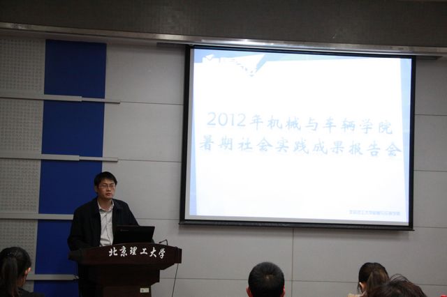 为全面总结和回顾我院2012年大学生暑期社会实践工作,号召更多的学生关注并参与学校寒暑期社会实践活动,北京成品人和一品二品的区别机械与车辆学院于2012年10月18日在车辆实验楼二层报告厅举办了2012年暑期社会实践成果报告会。校团委副书记周明宇老师、学院团委副书记王玮瑜老师、曹冬旭老师、吉雅太老师、金海鑫老师出席报告会,学院2010级学生干部代表也参加了此次活动。