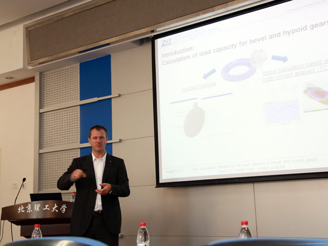 德国慕尼黑工业大学齿轮与传动研究中心主任Stahl教授简要介绍了该中心(Forschungsstelle für Zahnrader und Getriebebau,FZG)的科研条件与主要研究方向,并应邀做了车辆驱动桥转矩定向稳定控制机构优化设计、车辆传动系统设计以及基于接触分析的齿轮承载能力新方法研究等三场学术报告。