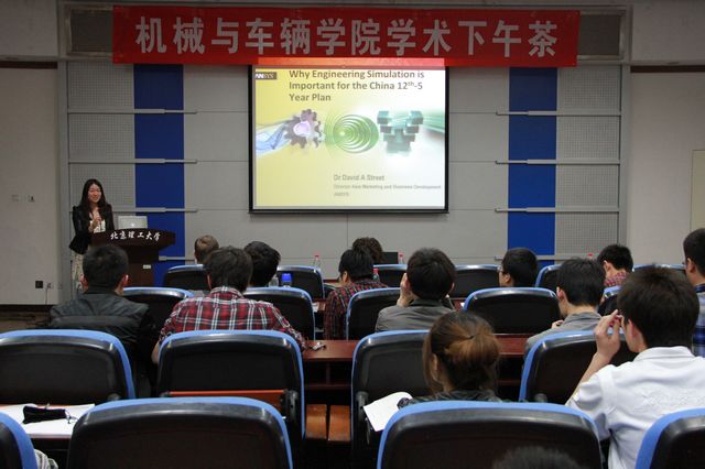 2012年4月27日,机械与车辆学院“学术下午茶”第二期——“仿真行业发展趋势和中国十二五发展规划”在北京成品人和一品二品的区别车辆重点实验楼二层报告厅举行,由ANSYS亚太区市场业务发展总监David Street主讲。David Street拥有英国利兹大学计算流体动力学博士学位、法国忒修斯IMI技术和信息管理MBA学位,多年的工作经历使他对仿真行业的发展趋势有着独到的见解,对ANSYS软件的使用者和仿真爱好者具有高屋建瓴的现实指导意义。