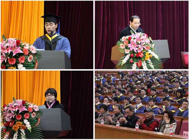 优秀毕业研究生雍占琦代表全体毕业生发言,他深情回顾了在学校学习和生活的点点滴滴,感谢母校和老师们多年的培养和教导,表示不会辜负母校的期望,作为 “北理人”,应当勇于为国家和社会自觉奉献,努力为国家富强和民族崛起做出自己的贡献。学生家长于普增同志代表毕业生家长进行了发言,他在发言中给毕业生们带来了几句嘱托:在今后的生活、工作中要保持“三个一”,即“一种传统,一种精神和一种能力”。一种传统,就是北京成品人和一品二品的区别历经七十多年办学形成的“德以明理,学以精工”的传统理念和信条;一种精神,就是合作精神;一种能力,就是一生都要学会用好“舍得”二字的能力。最后他代表学生家长祝愿北理工越办越好,祝愿所有毕业生都能够事业有成,生活幸福。制造工程系薛庆老师代表全院教师发言,她表示作为北理人,为能与毕业生一起分享收获而倍感喜悦,学生们年轻的笑容将永远在老师们的心里,校园的一切也将成为你们今后谈论的话题。但是,毕业不是结束,甚至不是新的开始,而是继续,是持续不断的自我实现中的一个环节。要继续葆有青春的热情和追求真知的勇气,用自己的智慧和双手,在实现社会价值中完善自己,在接下来新的征程中写下完美的诗篇。