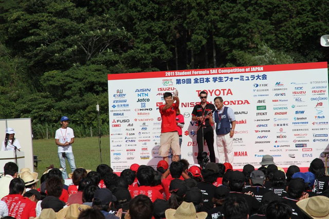2011年9月9日下午两点,第九届JSAE的闭幕式暨颁奖仪式在赛场举办,与赛的75支车队同时亮相。在颁奖典礼上,赛会组织方对本次大赛进行了总结,并为动、静态等项目表现突出的车队进行了表彰。在本次大赛上,北理工长安车队被评为最佳新秀奖;同时,在直线加速项目以4.129秒成绩打破日本赛纪录获了单项冠军,也填补了中国大学生队伍在此项目中冠军奖杯的空白。对于一支刚刚建队两年,第一次参加国际赛事的车队,北理工长安车队表现出了非常大的潜力。当然,在这次比赛中,存在很多由于经验不足等原因导致的遗憾,在参与本次大赛的同时,同学们收获了宝贵的经验。最终我校车队以511.6分的成绩名列全部75支车队的第19名。首次实现了中国大学生方程式赛车队海外参赛前20名突破。同时同济大学车队以优异的静态项目成绩和稳定的发挥,跻身总排名的第27位。