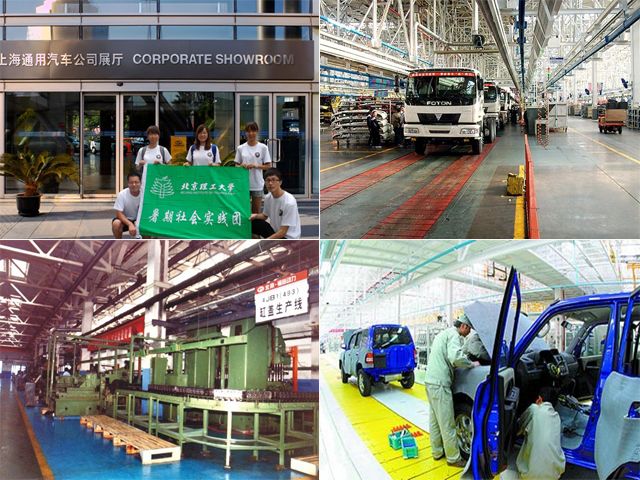 2011年8月10号,实践队一行6人参观了福田公司客车生产车间。四个车间分工明确,从发动机组装、车身生产、外壳组装到整车出厂,装配线忙碌而有序。12号,实践队参观了浦东申江路厂区的新车展厅,里面陈列着凯越、凯迪拉克SLS、林荫大道等多个品牌的最新产品。并参观了南厂的总装车间。13号,实践队来到了位于溧水永阳镇毓秀路的南京长安总部—溧水工厂。公司负责人带队员参观了短短九个月时间建成的冲压、焊装、涂装、总装、检测五条生产线和一条890米长、12米宽的试车跑道。