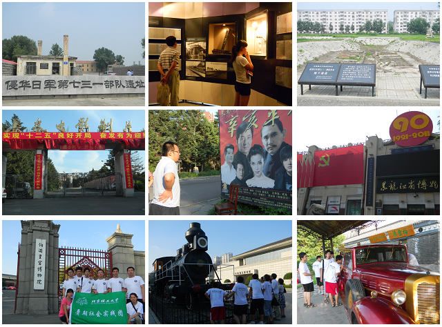 实践过程中,我们参观了哈尔滨市平房区侵华日军第七三一部队遗址,在当年日军七三一部队的本部大楼里,现在有13个展室,分别展览着当年731部队考察、试验的各种图片、仪器以及资料。走出本部大楼,沉痛的心情仍久久不能平静。伪满皇宫博物院是清朝末代皇帝溥仪充当伪满洲国皇帝时居住的宫殿,是日本帝国主义武力侵占中国东北的历史见证。实践团成员饶有兴趣地研究了当年溥仪乘坐的轿车和观光火车。这些展品,都向人们诉说着日军侵华东北沦陷的历史,也在警示每一个中国人:勿忘国耻(历史印记图)。