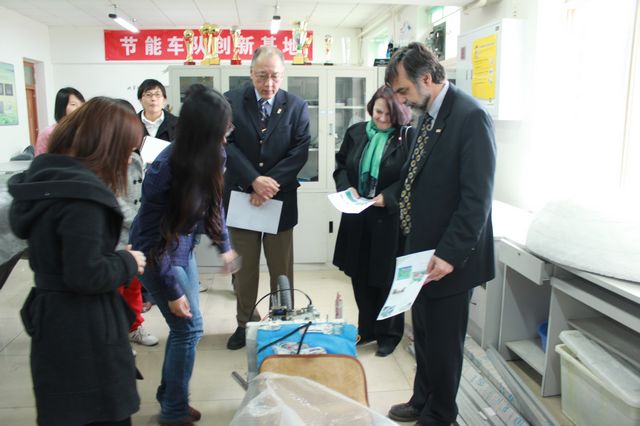 里夏-布兰处长介绍了加拿大节能车冠军队“LAVAL车队”的发展现状和技术创新,同时带来了来自异国队友的祝福与问候。随后,俱乐部代表向加拿大代表队介绍了我校节能车、太阳能车的发展历程,详细的交流了在改装发动机、传动设计、点火设计方面的技术手段和心得体会,包括切除气门摇臂、切除变速箱、使用双火花塞等创新之举,赢得里夏-布兰处长等来宾的啧啧称赞,来宾们充分肯定了我校节能车发展所代表的中国节能车水平。