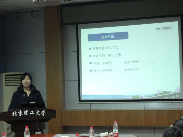 在精英论坛活动中也涌现出了很多优秀的学生。在“学生干部的领导气质”子论坛上,来自机械与车辆学院工业工程二班的陈婧同学,就从个人领悟出发,详细阐述了何谓气质。并从“做人的气质”、“年轻人的气质”、“大学生的气质”等方面切入深刻讨论了气质的各种表现,最后,拢向主题着重讲解了学生干部的领导气质,其精彩表现赢得了在场每一位同学的掌声。